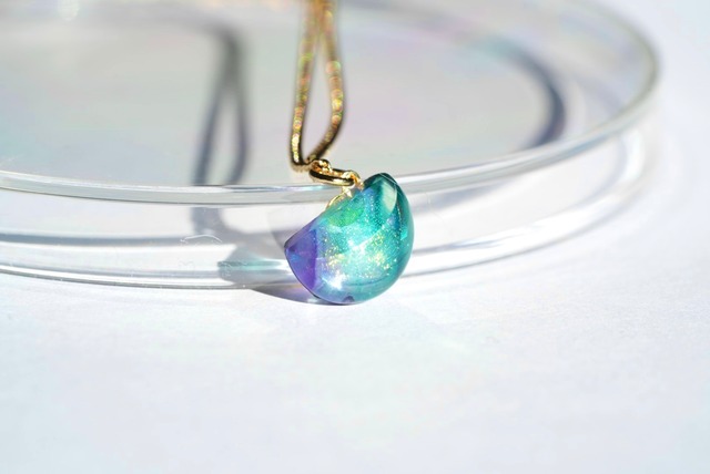 月の満ち欠けをイメージして作ったガラスのネックレスです。虹色のガラスを使用しているので角度によってことなる輝きが楽しめます。小さなガラスの三日月が胸元でキラキラ輝くデザインです。 使用したアンティークガラスは、昔ながらの製法で作られた特別なガラスで、海外の職人さんが1枚づつ手作りで吹いて制作したものです。吹きガラスならではの色彩の美しさや透明感をお楽しみいただけます。また、一枚の絵のような複雑な模様のガラスから切り出すかけらを使用しているので、たった一つのオリジナルのガラスです。 ガラスの選別から、焼成、整形にいたるまで丁寧に手作業で行っています。 金具は針金のように自分で曲げられるタイプの金具となっておりますのでご自分でお好みのサイズに調節いただけます。 発送目安:10日程度