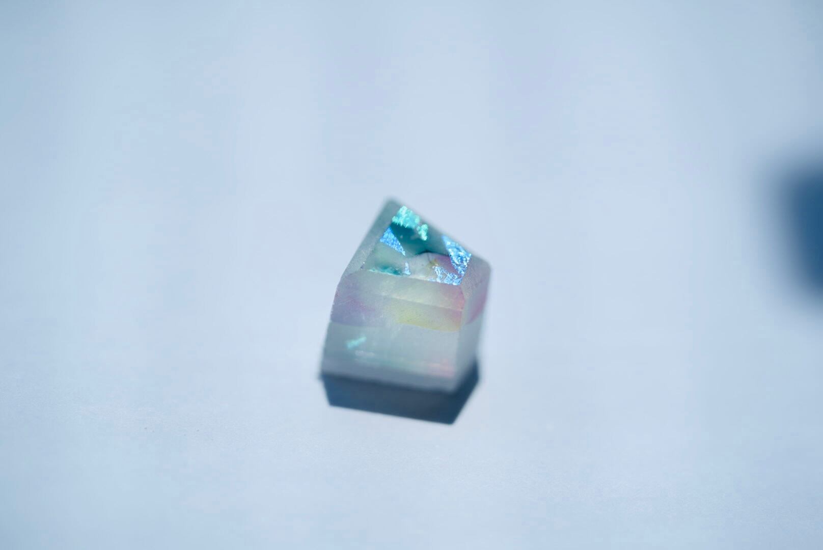 アンティークガラスの色彩と光を取り込む仕組みを採用したガラスのアートピースです。Xガラスのままご購入も可能です。このガラスはアンティークガラスのかけらと虹色ガラスのかけらを使用して色鮮やかなprismglassで色をブレンドしています。また、底面に光を集めやすい加工を施しているので、光にあたると鋭く光る部分と、柔らかくひかる部分が浮き上がります。