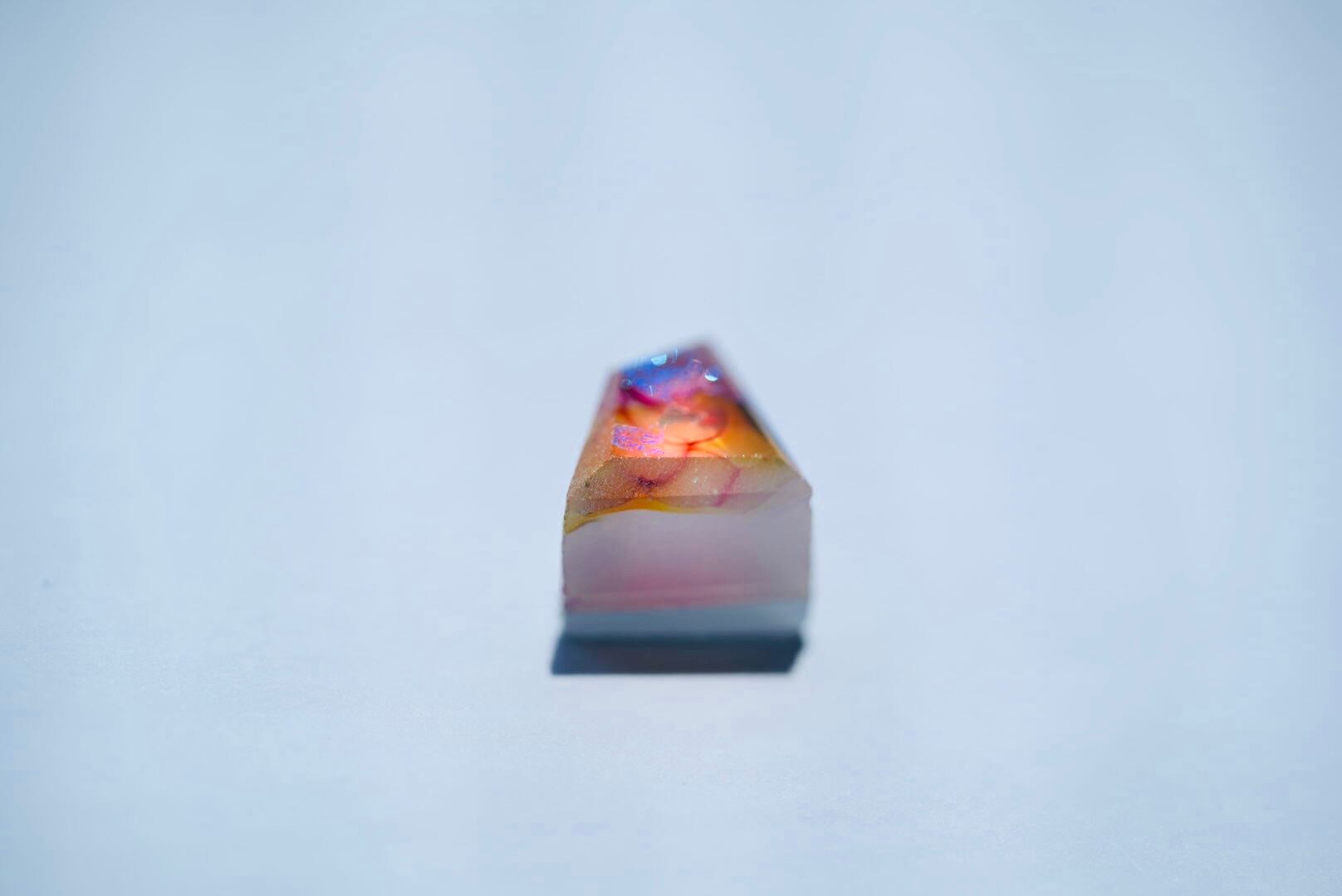 アンティークガラスの色彩と光を取り込む仕組みを採用したガラスのアートピースです。Xガラスのままご購入も可能です。このガラスはアンティークガラスのかけらと虹色ガラスのかけらを使用して色鮮やかなprismglassで色をブレンドしています。また、底面に光を集めやすい加工を施しているので、光にあたると鋭く光る部分と、柔らかくひかる部分が浮き上がります。