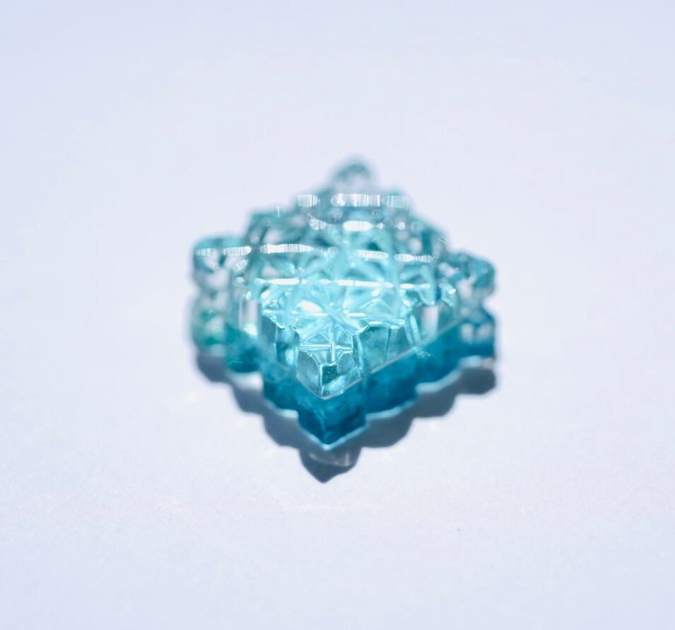 アンティークガラスに切子加工を施したネックレスです。光が当たると水面のような輝きを放ちます。上面だけでなく壁面にも深いカットを施しているため、どの面から見てもカット面が目立つのが特徴です。アンティークガラスの複雑な色彩の上に浮かぶきらきらの影がとても美しいガラスです。