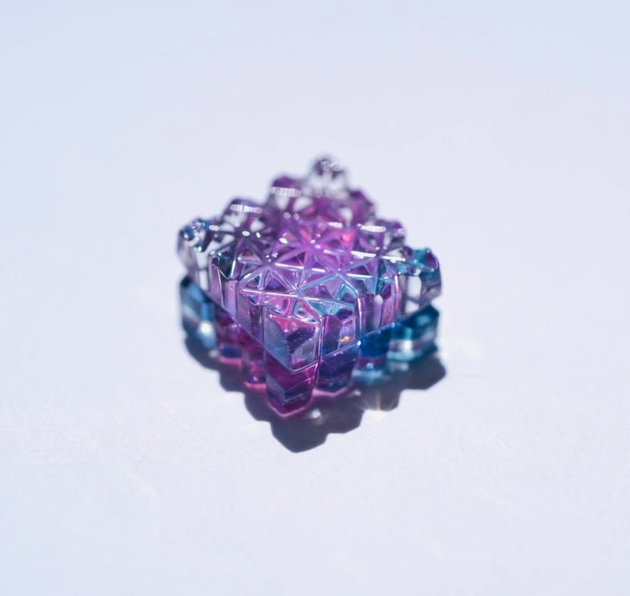 アンティークガラスに切子加工を施したネックレスです。光が当たると水面のような輝きを放ちます。上面だけでなく壁面にも深いカットを施しているため、どの面から見てもカット面が目立つのが特徴です。アンティークガラスの複雑な色彩の上に浮かぶきらきらの影がとても美しいガラスです。