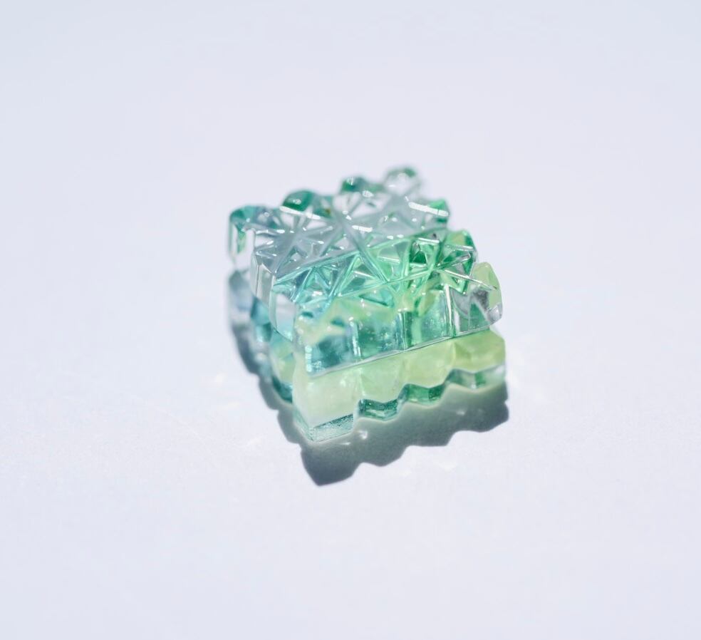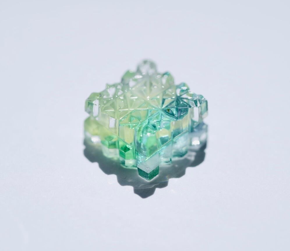 アンティークガラスに切子加工を施したネックレスです。光が当たると水面のような輝きを放ちます。上面だけでなく壁面にも深いカットを施しているため、どの面から見てもカット面が目立つのが特徴です。アンティークガラスの複雑な色彩の上に浮かぶきらきらの影がとても美しいガラスです。
