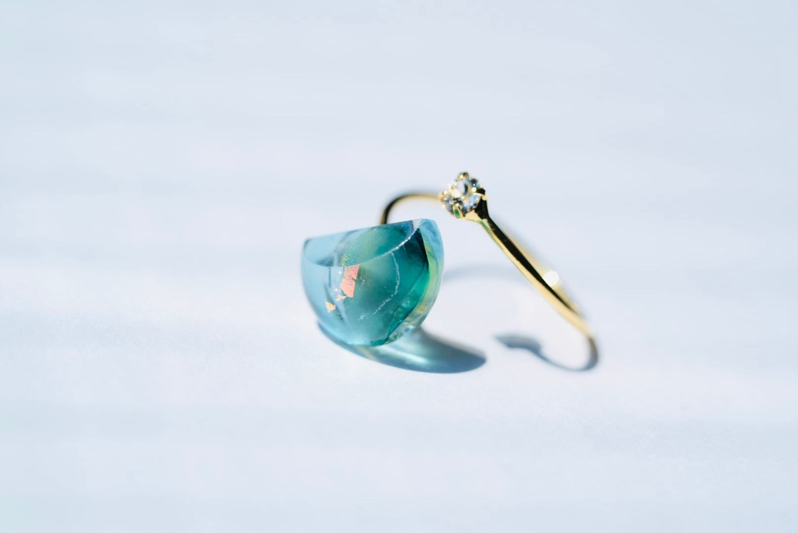 月の満ち欠けをイメージして作ったガラスのリングです。虹色のガラスを使用しているので角度によってことなる輝きが楽しめます。また、スパイラルの金具の先についているストーンが煌めく仕様です。