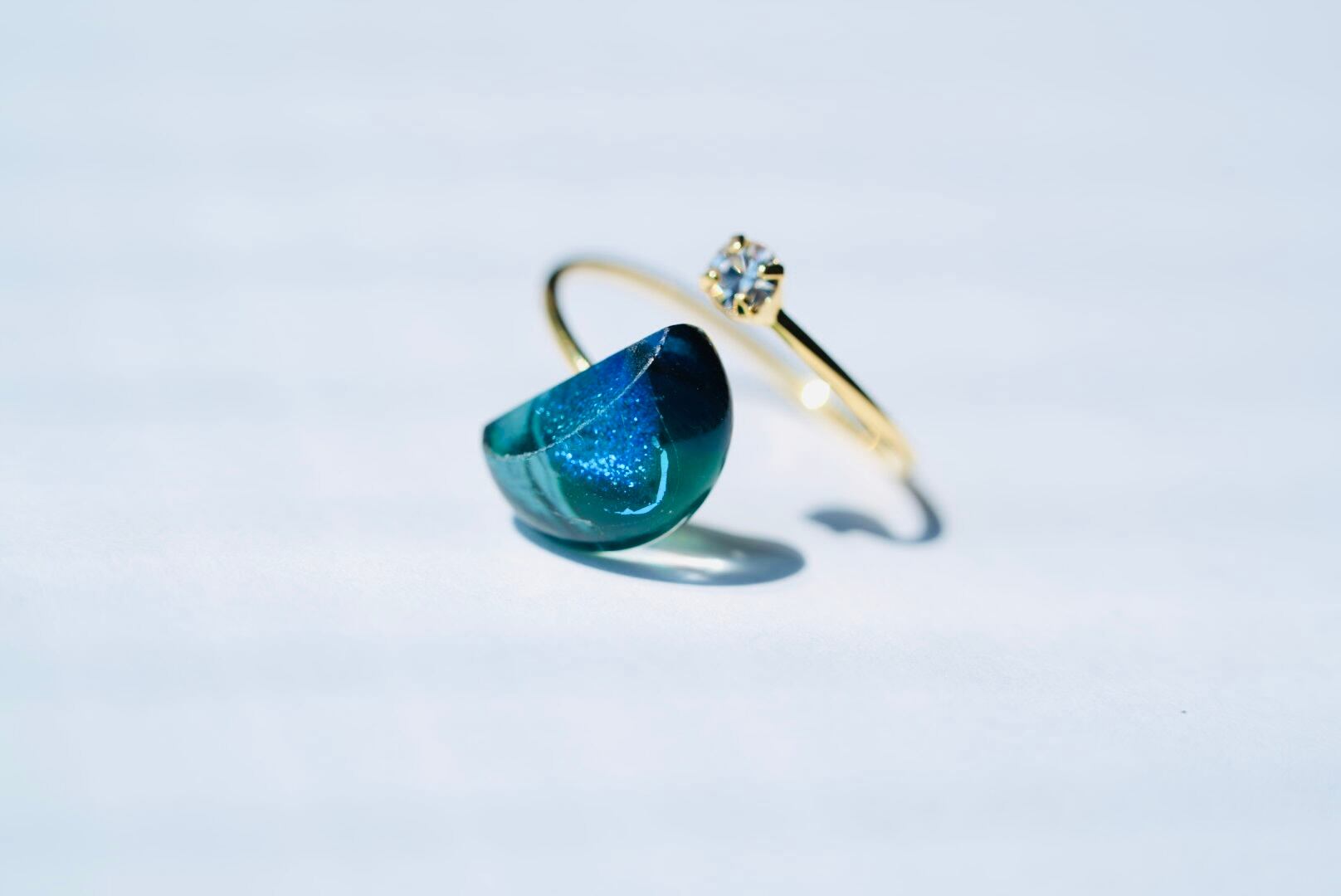 月の満ち欠けをイメージして作ったガラスのリングです。虹色のガラスを使用しているので角度によってことなる輝きが楽しめます。また、スパイラルの金具の先についているストーンが煌めく仕様です。