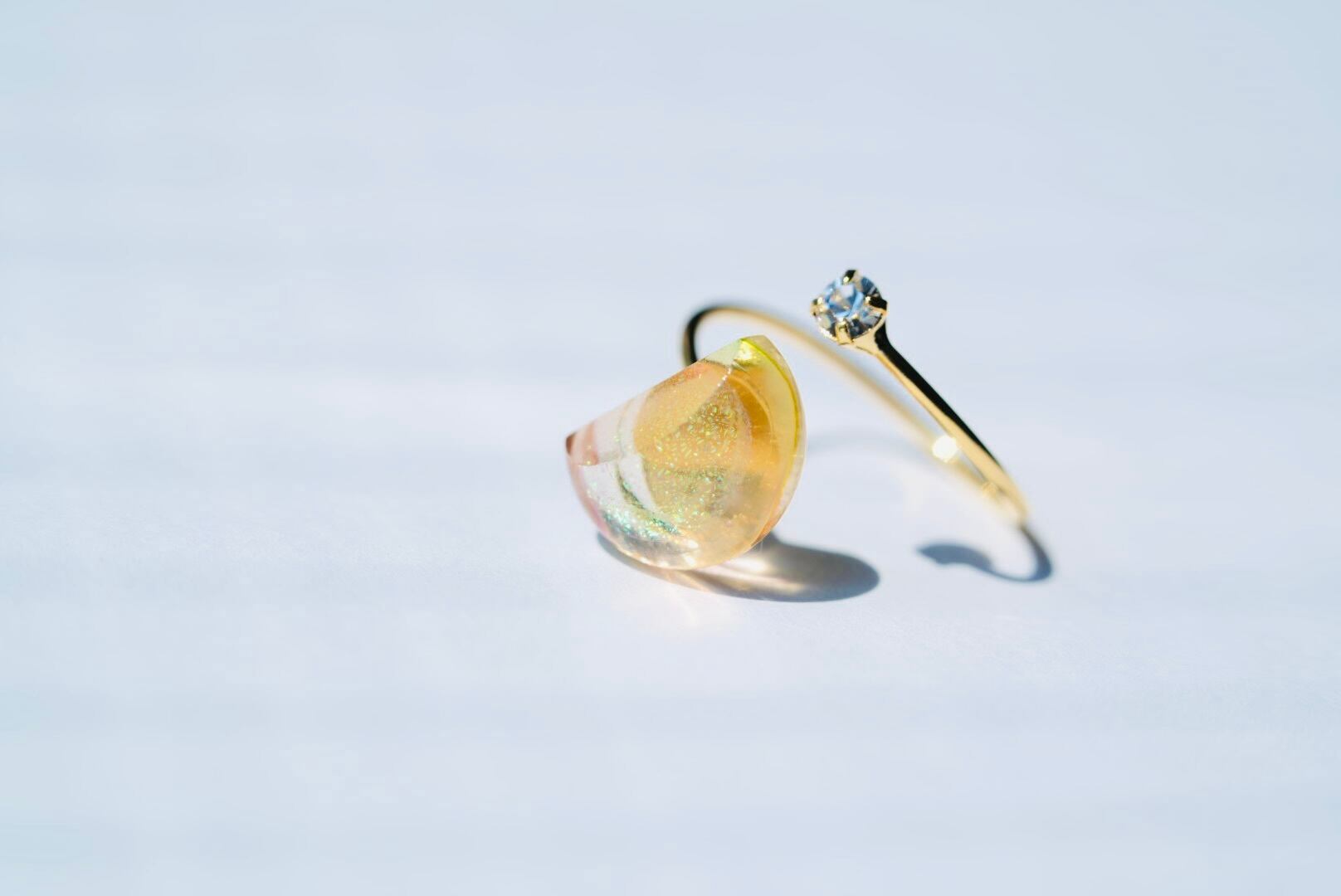 月の満ち欠けをイメージして作ったガラスのリングです。虹色のガラスを使用しているので角度によってことなる輝きが楽しめます。また、スパイラルの金具の先についているストーンが煌めく仕様です。