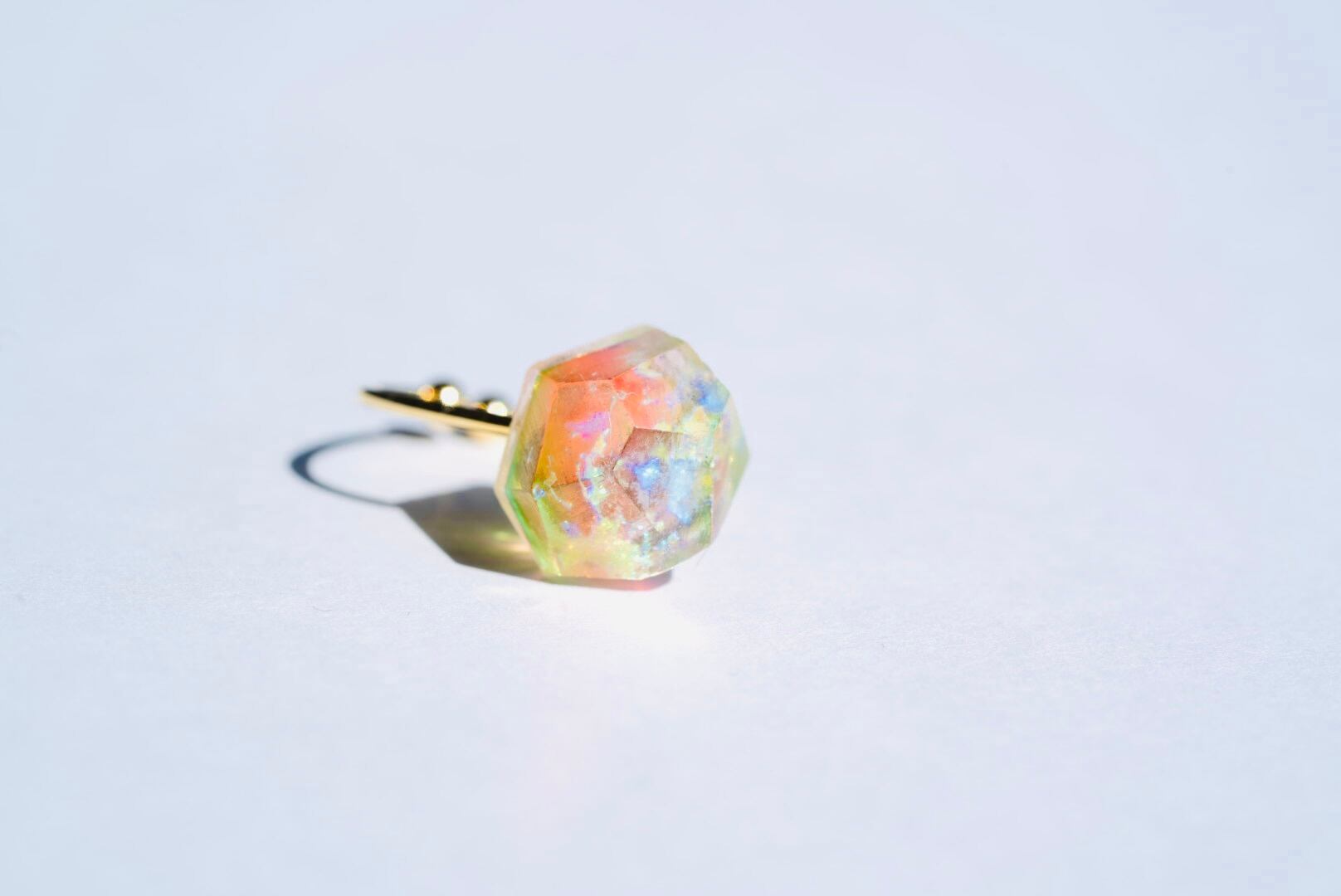 数層に重ねたガラスを多面体にカットして鉱物をイメージした形に研磨して製作したリングです。ガラスだからこそだせる色合いと形が特徴です。層の中に虹色のガラスを閉じ込めているので向きを変えると虹色がきらきらと輝きます。