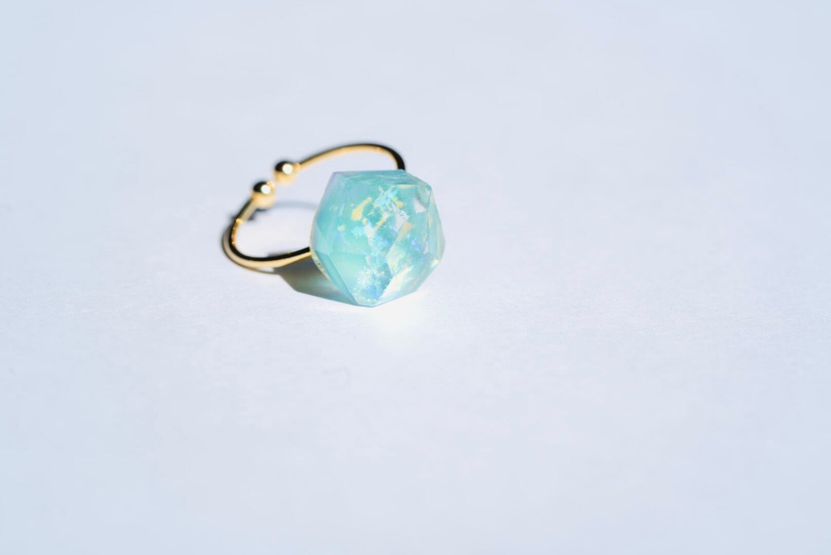 数層に重ねたガラスを多面体にカットして鉱物をイメージした形に研磨して製作したリングです。ガラスだからこそだせる色合いと形が特徴です。層の中に虹色のガラスを閉じ込めているので向きを変えると虹色がきらきらと輝きます。