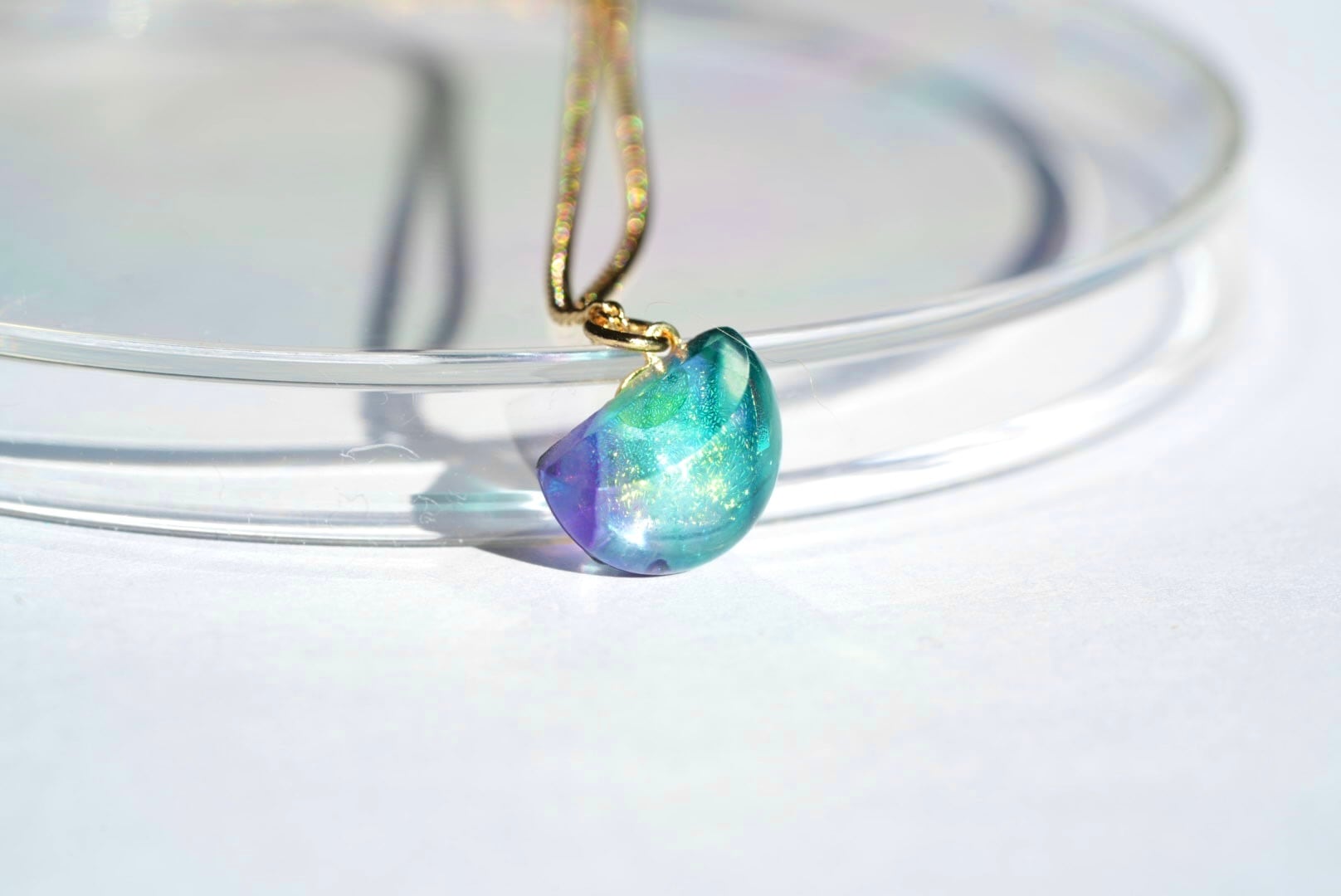 月の満ち欠けをイメージして作ったガラスのネックレスです。虹色のガラスを使用しているので角度によってことなる輝きが楽しめます。小さなガラスの三日月が胸元でキラキラ輝くデザインです。