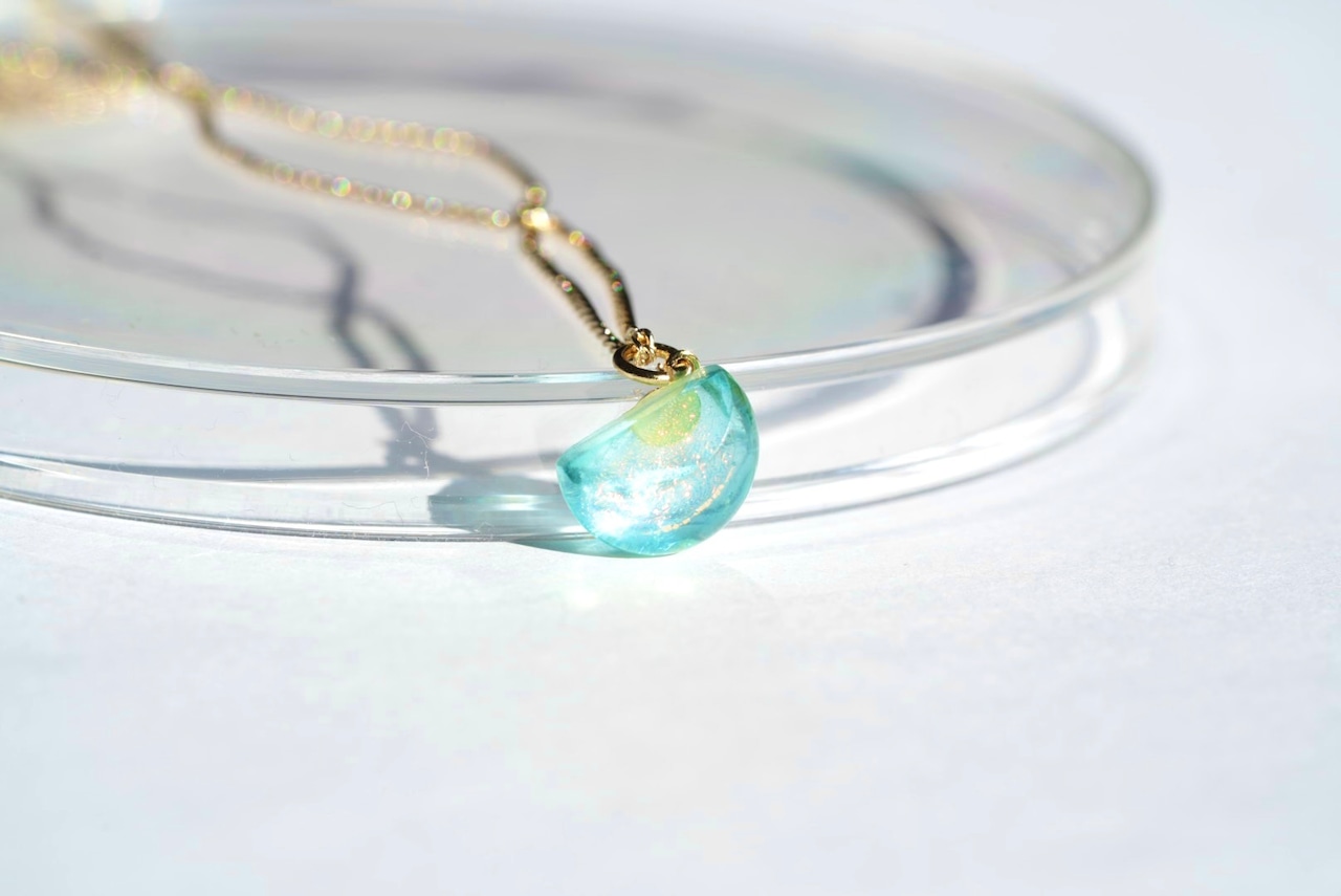 月の満ち欠けをイメージして作ったガラスのネックレスです。虹色のガラスを使用しているので角度によってことなる輝きが楽しめます。小さなガラスの三日月が胸元でキラキラ輝くデザインです。
