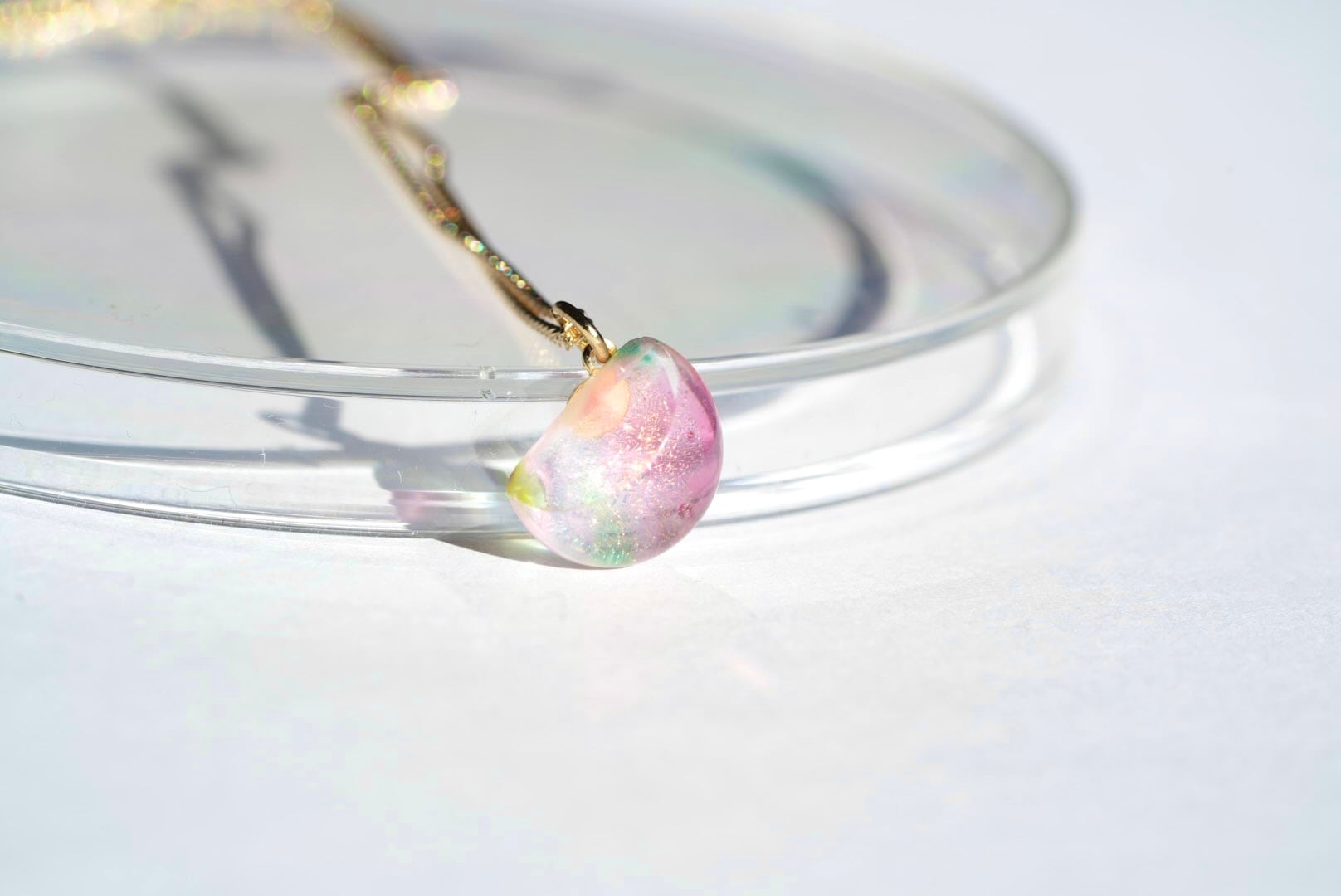 月の満ち欠けをイメージして作ったガラスのネックレスです。虹色のガラスを使用しているので角度によってことなる輝きが楽しめます。小さなガラスの三日月が胸元でキラキラ輝くデザインです。