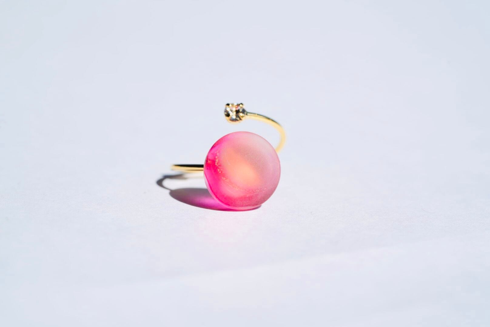 朧月をイメージした曇りガラスのリングです。今回は近くに煌めく星と軌道をイメージした金具に接着しているため、曇りガラスの横にクリスタルストーンが煌めきます。指に巻きつくようなデザインで華奢な印象です。