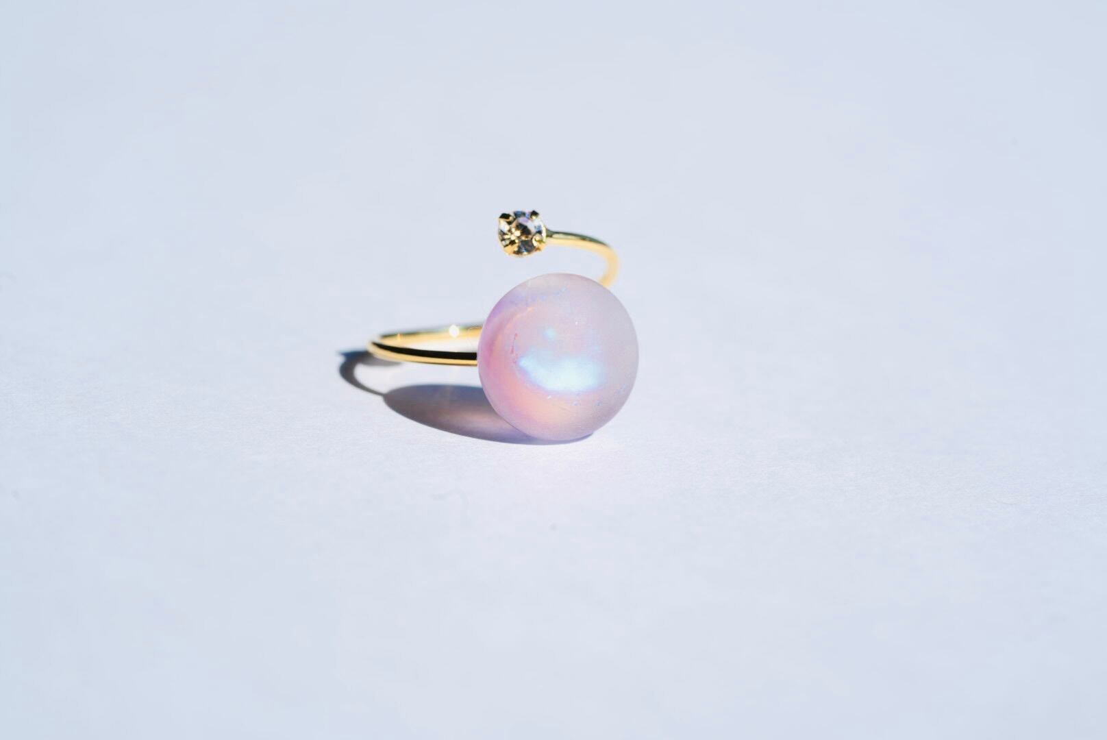 朧月をイメージした曇りガラスのリングです。今回は近くに煌めく星と軌道をイメージした金具に接着しているため、曇りガラスの横にクリスタルストーンが煌めきます。指に巻きつくようなデザインで華奢な印象です。