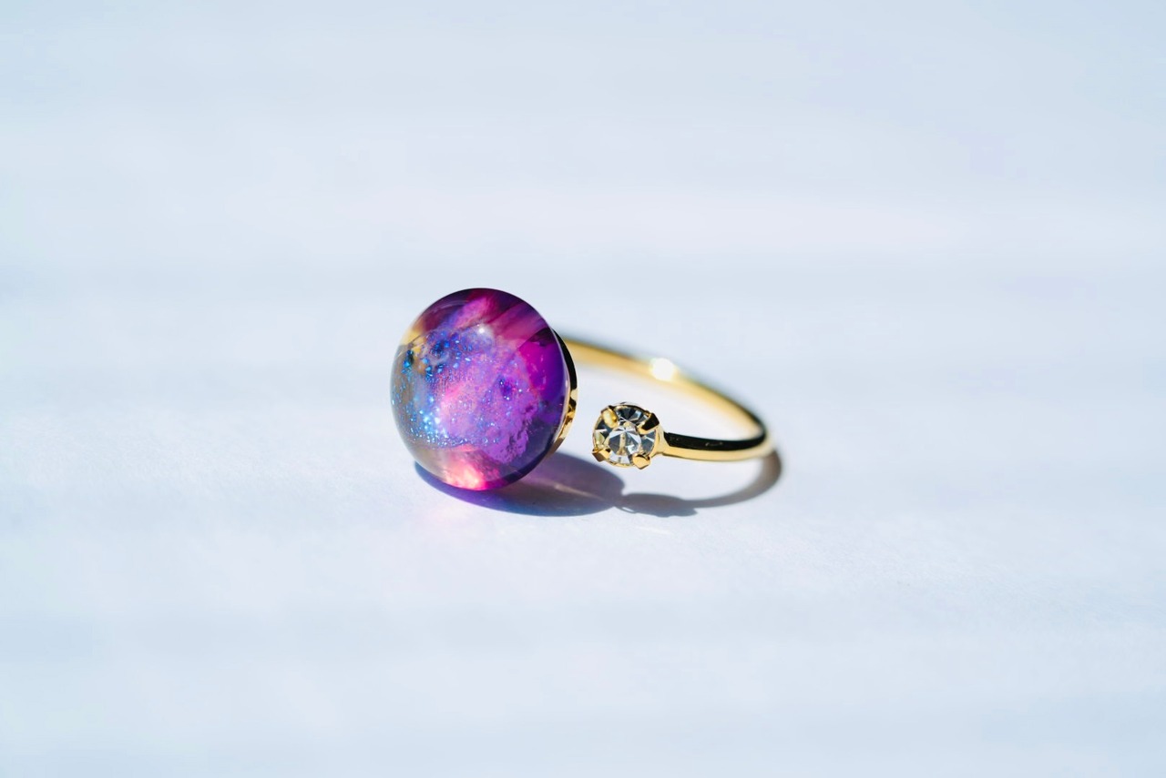 ガラスの色を最大限に引きだし、色の標本を意識して製作したリングです。リングのガラス部分の後ろが空枠になっているので、硝子の色がそのまま透ける仕様となっています。虫眼鏡を通して空の色をそのまま標本したようなリングです。