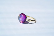 このリングに使用したガラスは、昔ながらの製法で作られた特別なガラスを使用しているため、ガラスの色彩の美しさや透明感が特徴です。また、一枚の絵のような複雑な模様のガラスから切り出すかけらを使用しているので、たった一つのオリジナルのガラスです。