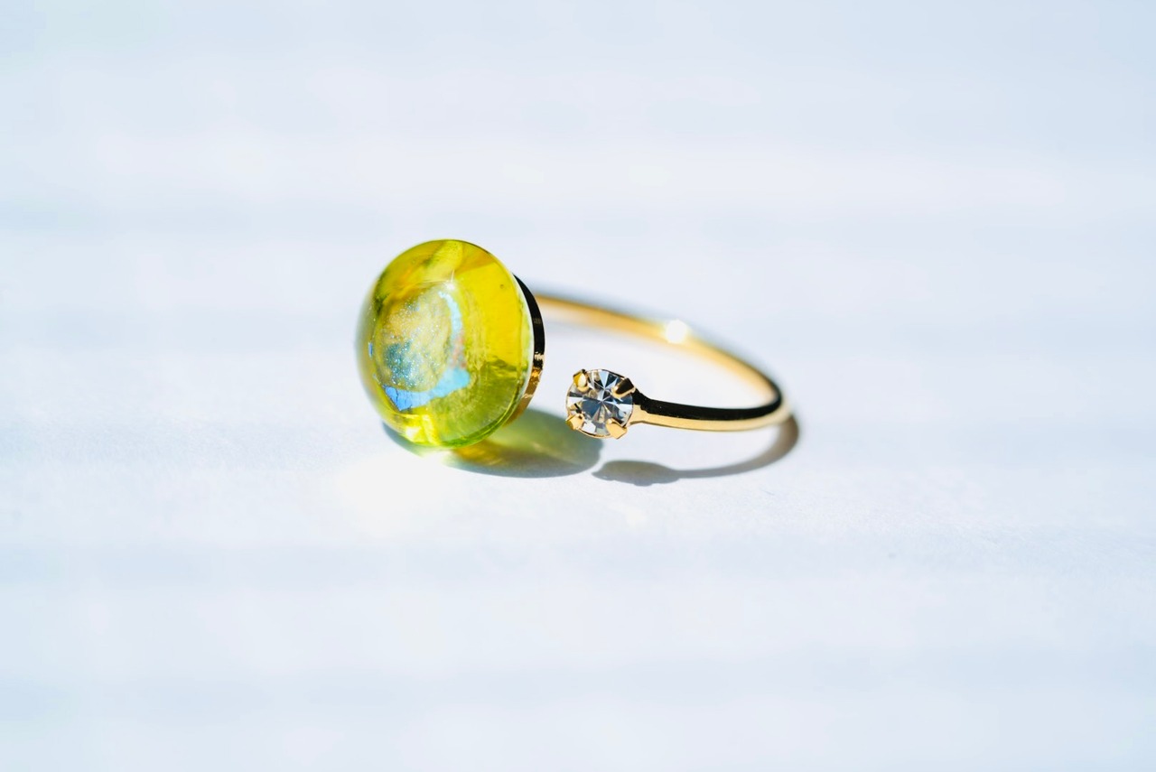 ガラスの色を最大限に引きだし、色の標本を意識して製作したリングです。リングのガラス部分の後ろが空枠になっているので、硝子の色がそのまま透ける仕様となっています。虫眼鏡を通して空の色をそのまま標本したようなリングです。