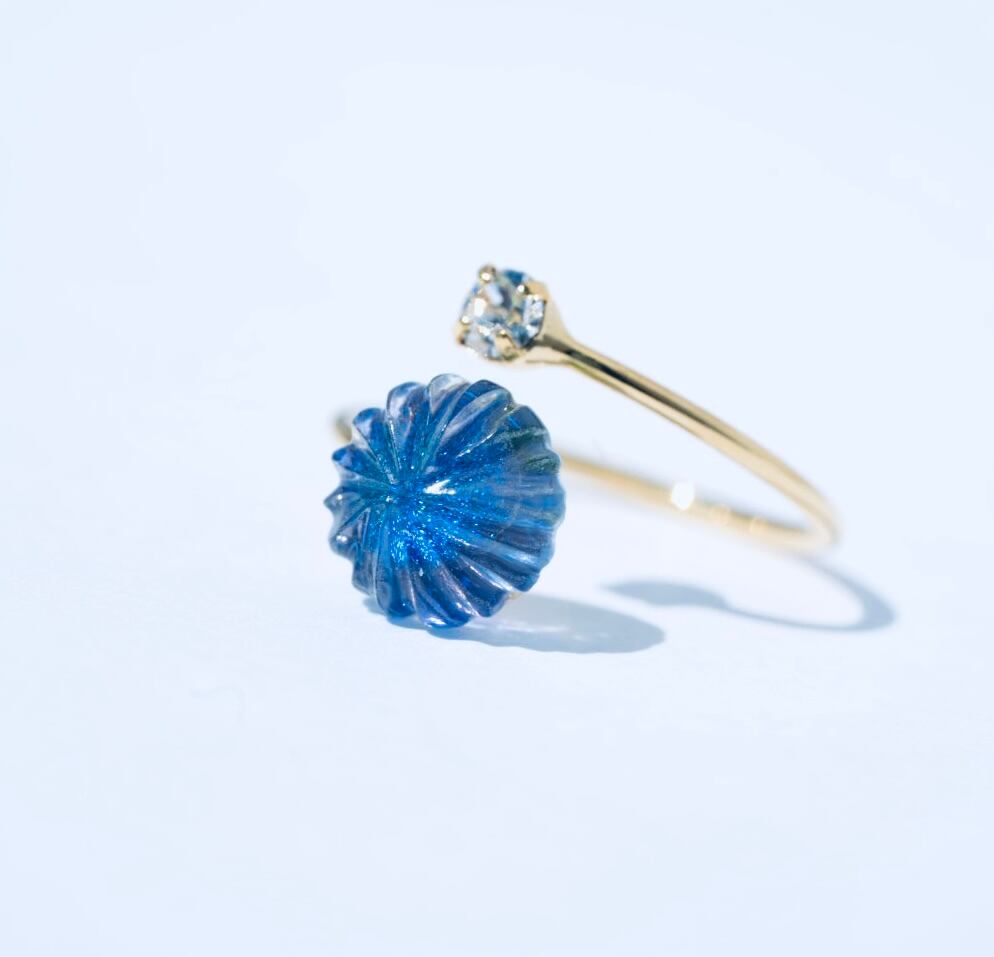 ガラスの形は一つ一つ手で削ってつくりあげています。たくさんの面に光が反射してキラキラかがやきます。カット面の美しさもこのリングの特徴となっています。