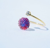 ガラスの形は一つ一つ手で削ってつくりあげています。たくさんの面に光が反射してキラキラかがやきます。カット面の美しさもこのリングの特徴となっています。