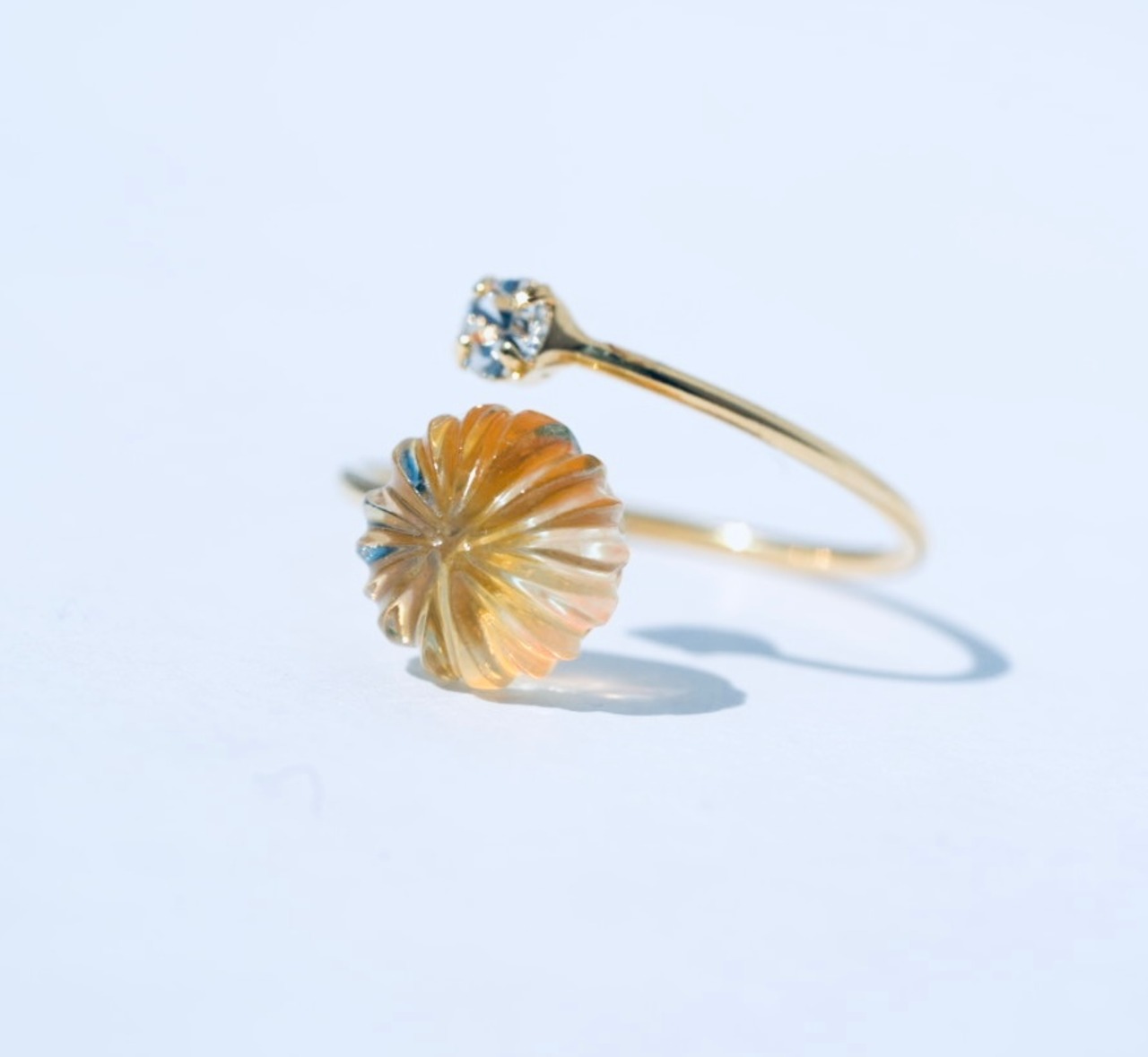 ガラスの形は一つ一つ手で削ってつくりあげています。たくさんの面に光が反射してキラキラかがやきます。カット面の美しさもこのリングの特徴となっています。