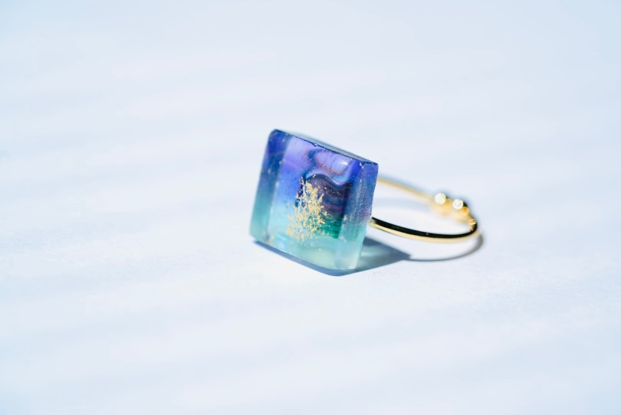 このリングには、昔ながらの製法で作られた特別なガラスを使用しているため、ガラスの色彩の美しさや透明感が特徴です。また、一枚の絵のような複雑な模様のガラスから切り出すかけらを使用しているので、たった一つのオリジナルのガラスです。
